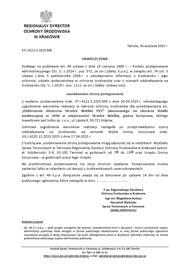 Obwieszczenie dot. przedsięwzięcia pn. „Elektrownia słoneczna Strzelce Wielkie PV2”