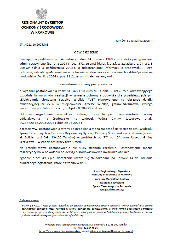 Obwieszczenie dot. przedsięwzięcia pn. „Elektrownia słoneczna Strzelce Wielkie PV6”
