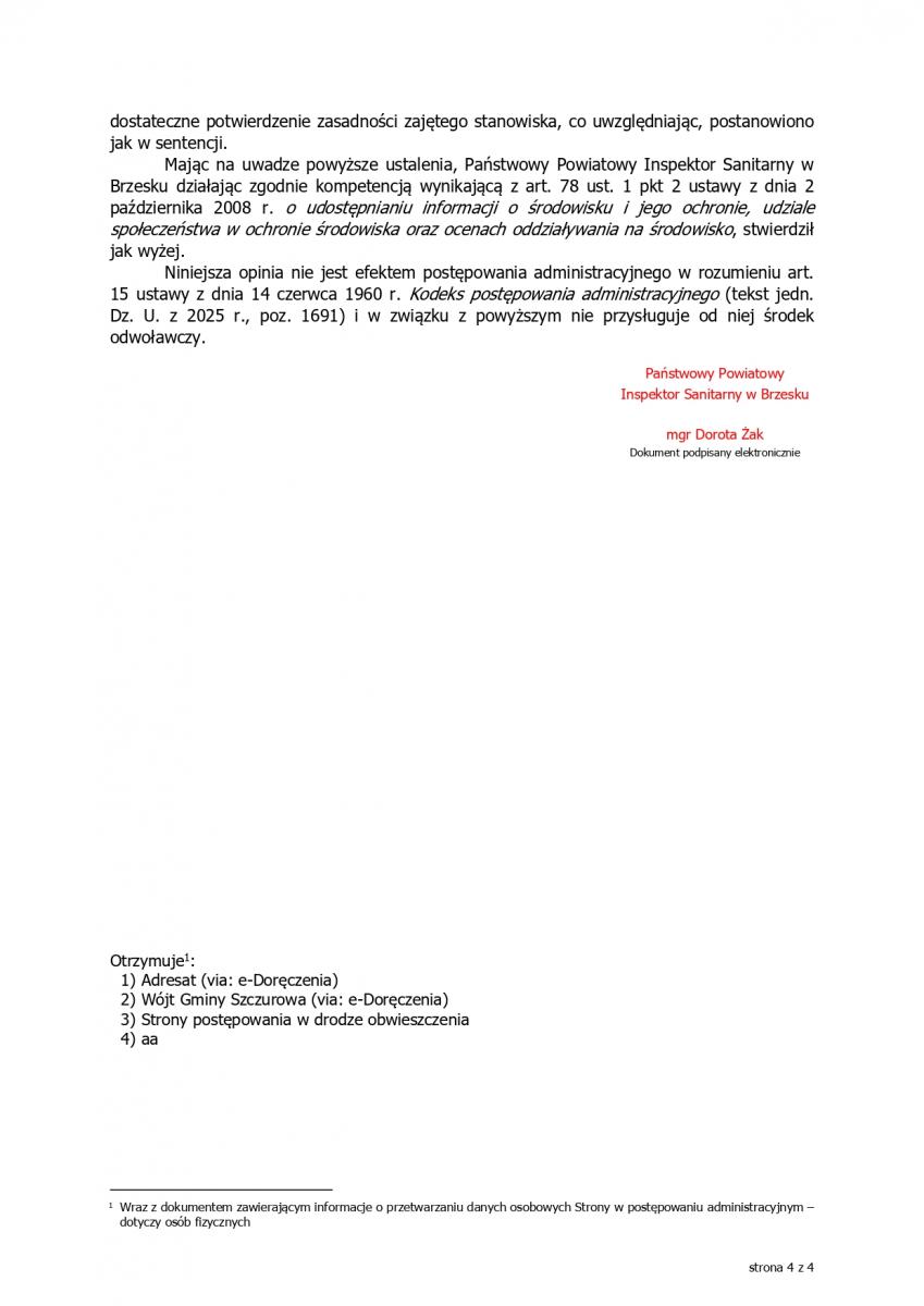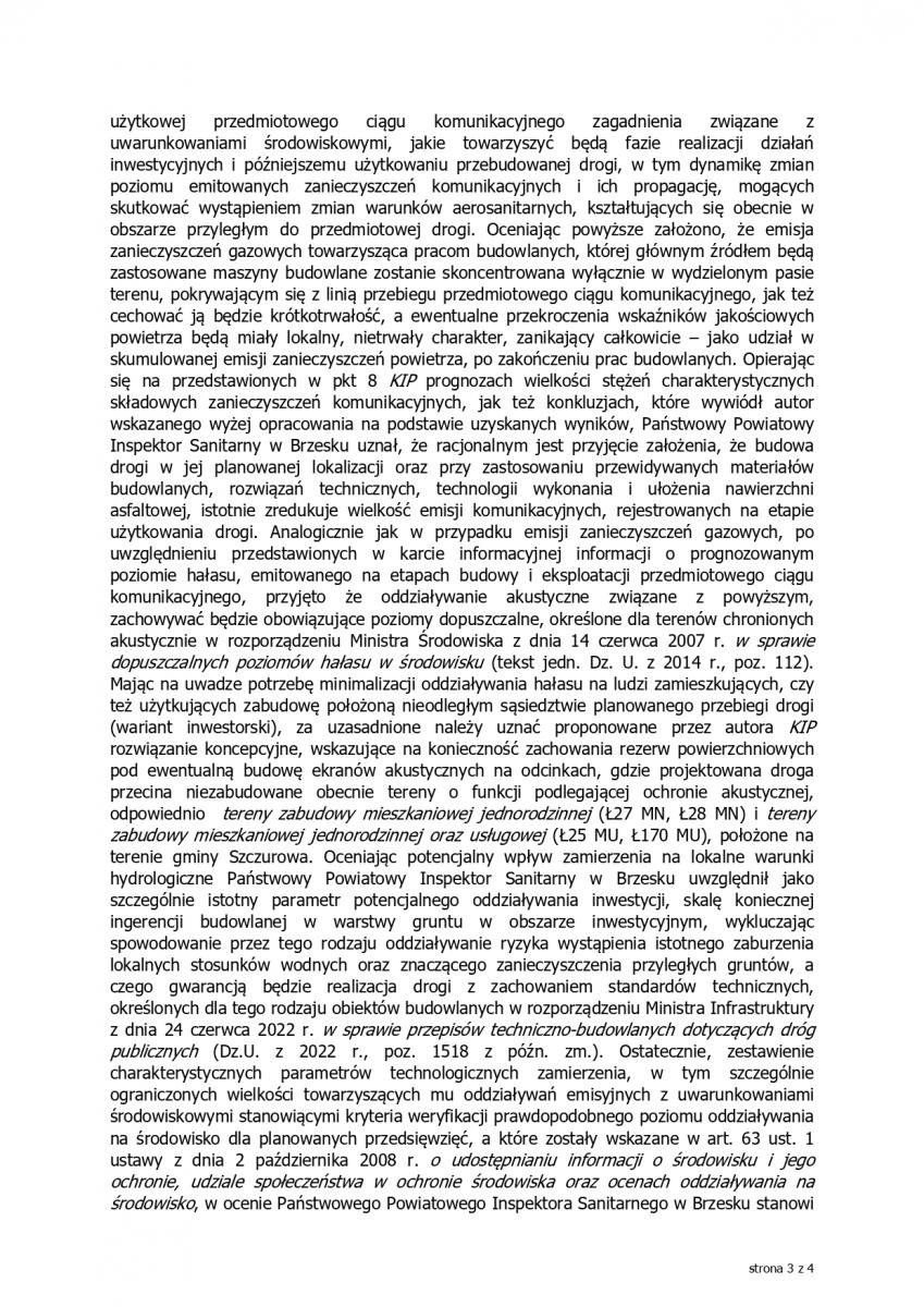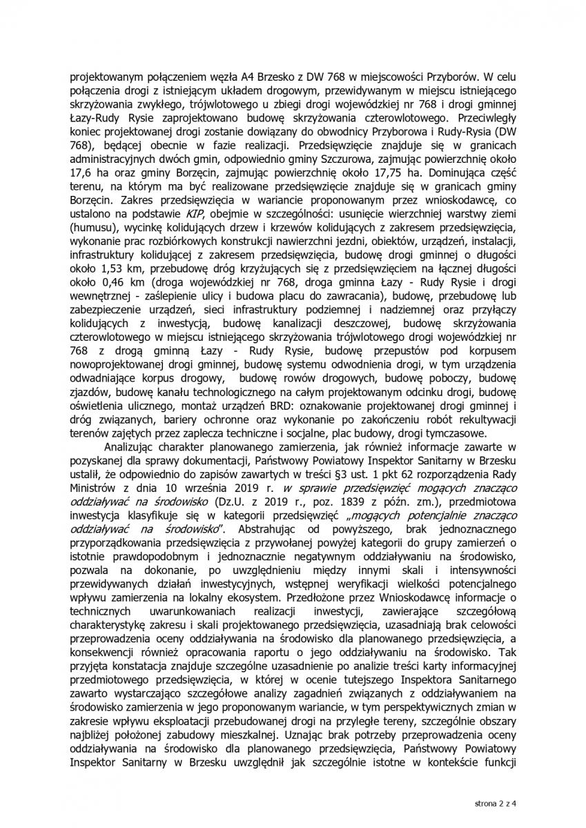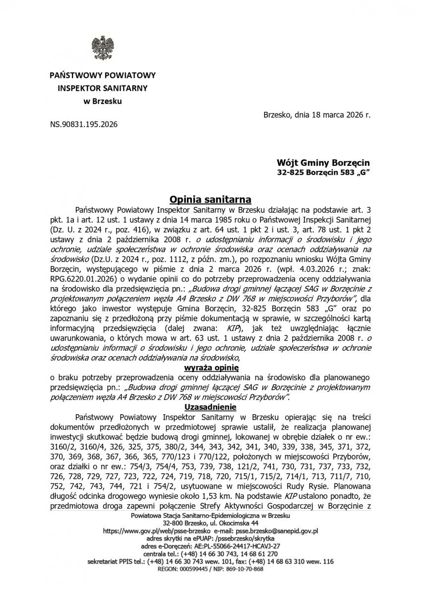 Opinie sanitarna - "Budowa drogi gminnej łączącej SAG w Borzęcinie z projektowanym połączeniem węzła A4 Brzesko z DW 768 w miejscowości Przyborów”