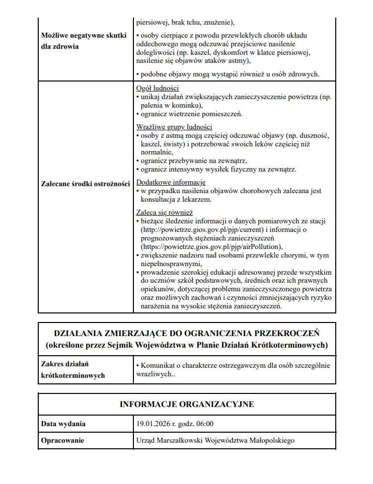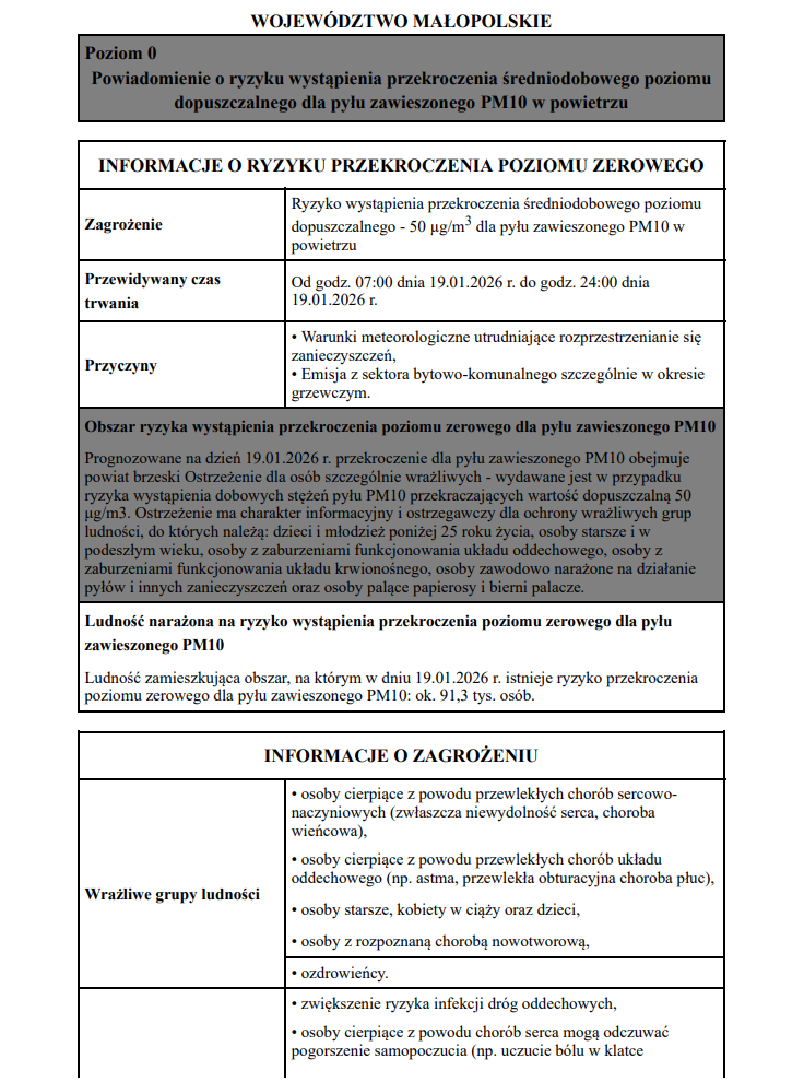 Powiadomienie o ryzyku wystąpienia przekroczenia średniodobowego poziomu dopuszczalnego dla pyłu zawieszonego PM10 w powietrzu