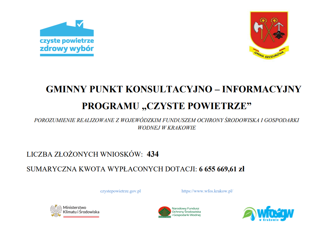 Więcej informacji dotyczących Programu „ Czyste Powietrze” można uzyskać w Gminnym Punkcie Konsultacyjno – Informacyjnym w Urzędzie Gminy Szczurowa oraz pod numerem telefonu: 14 632 09 16.