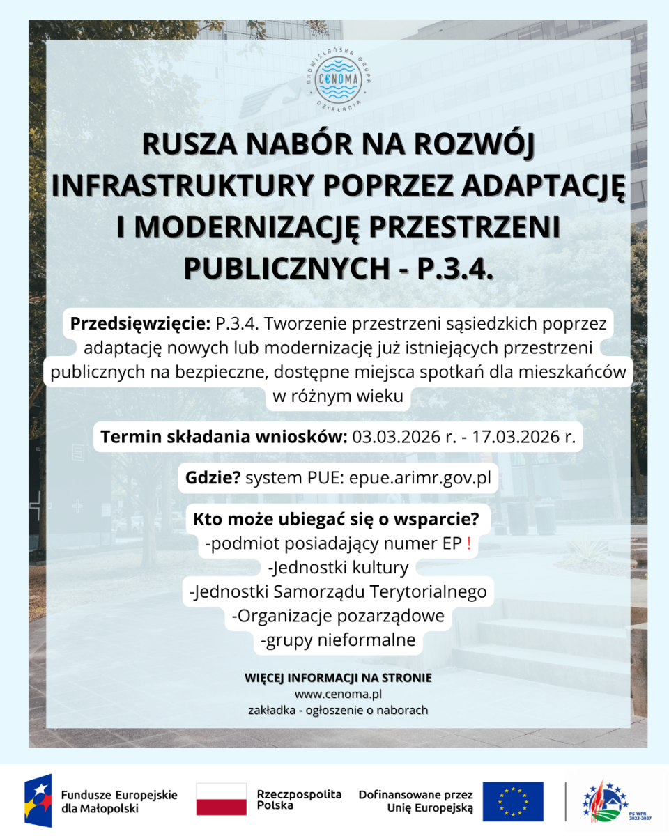 Stowarzyszenie Nadwiślańska Grupa Działania „E.O.CENOMA”, działające na obszarze: Gmina Szczurowa, Gmina Drwinia, Gmina Rzezawa, Miasto i Gmina Koszyce oraz Miasto i Gmina Kazimierza Wielka ogłasza nabór wniosków numer 752 888 w ramach Planu Strategicznego dla Wspólnej Polityki Rolnej na lata 2023–2027 dla interwencji I.13.1 LEADER/Rozwój Lokalny Kierowany przez Społeczność (RLKS) – komponent Wdrażanie LSR.