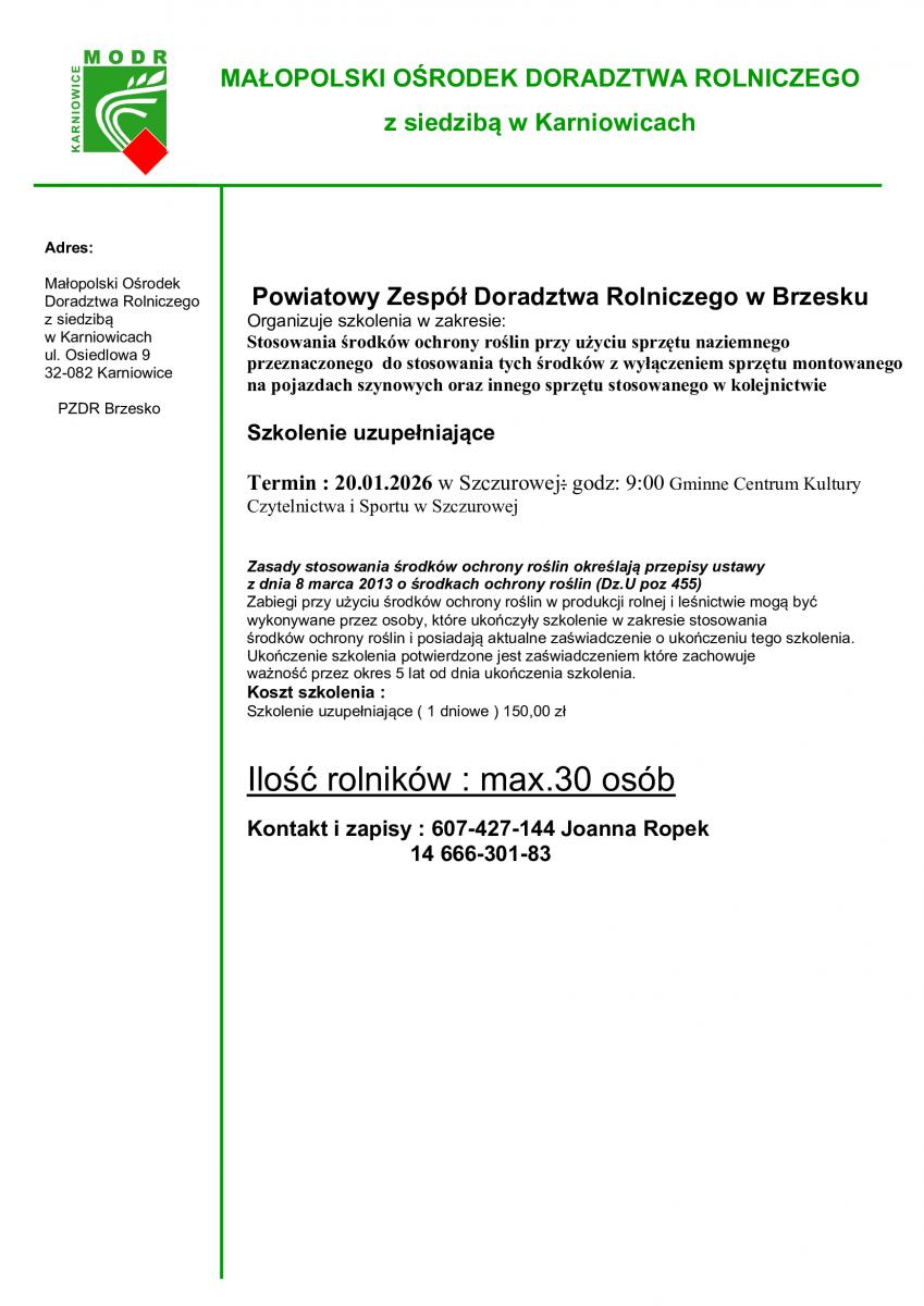Powiatowy Zespół Doradztwa Rolniczego w Brzesku zaprasza na szkolenie uzupełniające z zakresu stosowania środków ochrony roślin przy użyciu sprzętu naziemnego, przeznaczonego do stosowania tych środków (z wyłączeniem sprzętu montowanego na pojazdach szynowych oraz sprzętu stosowanego w kolejnictwie).